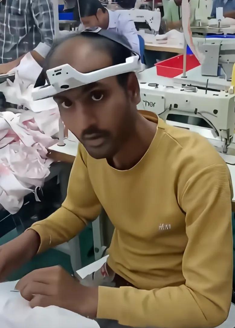 曝光的视频和照片显示,这些工厂的一线缝纫工人,被强制要求佩戴两种特制设备:一种是套在食指上的微型摄像指环,可高清拍摄手部穿针、走线、打结的每一个细微动作;另一种是轻便的头戴式摄像头,从正面捕捉工人操作时的手势力度、动作频率,甚至面部神态。