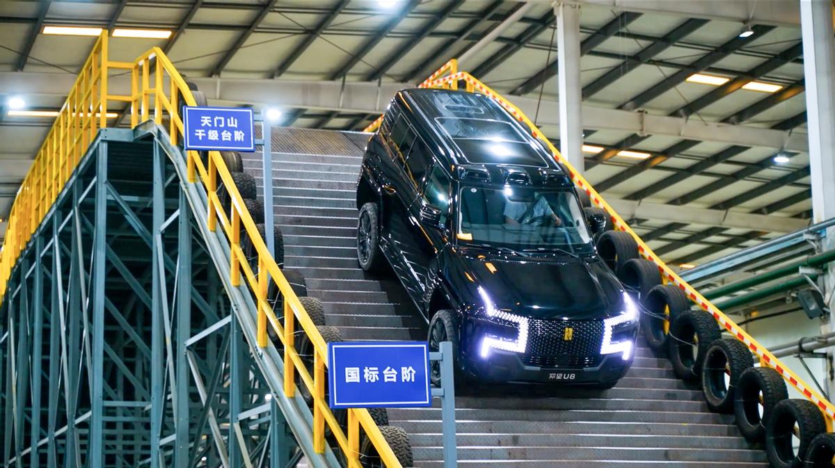 有意思的是,除了常规的越野项目以外,这次仰望U8还玩了个“花活”——倒爬天门山天梯,全程没有打滑,不犹豫,非常稳健地就倒上去了。
