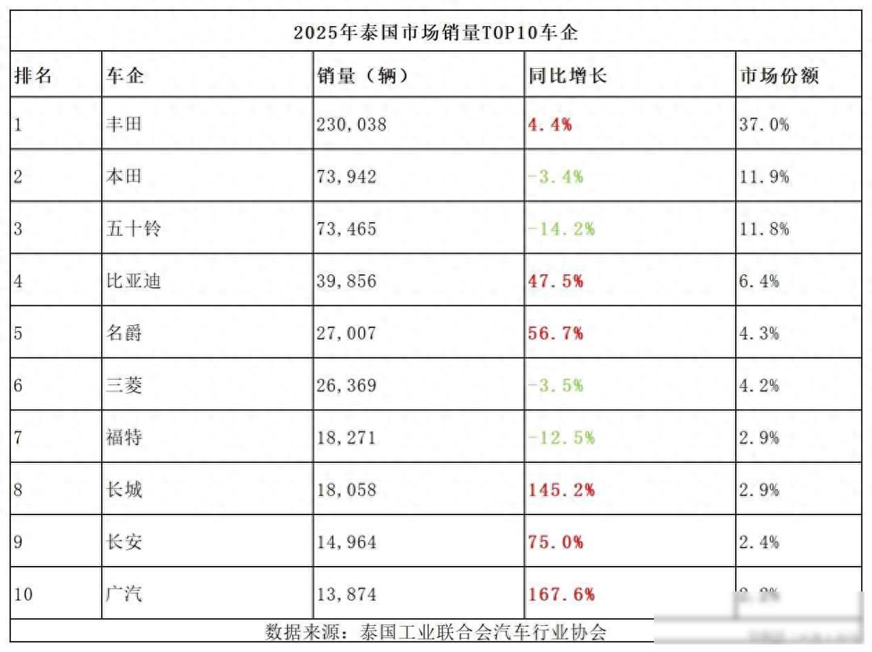 2025年泰国销量前十的车型中,有五款来自中国品牌,比亚迪排名第四,单月注册量达到39856辆,这个数字也包含了其子品牌腾势的销量,海豚这款车更是直接进入了全市场前十名,过去日本车在泰国市场占据主导地位,人们一提到买车首先想到的就是丰田、本田或日产,但如今情况已经改变,铃木关闭了在泰国的工厂并转卖给了福特,本田和日产纷纷缩减产量,三菱也宣布到2026年不再开设第三家工厂,与此同时中国车企在泰国的产能迅速增长,从2023年的18万辆提升至2025年的55万辆,这些工厂里92%的员工是本地工人,超过一半的零部件也在泰国当地生产。