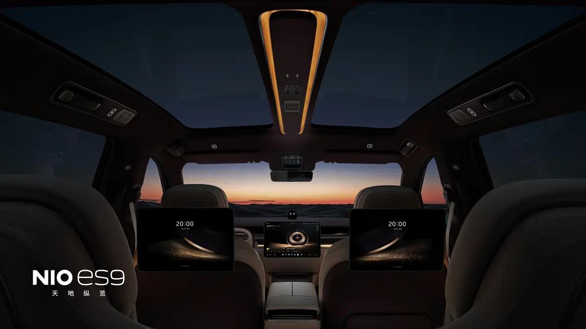 智能交互看齐ET9,一块15.6英寸的AMOLED悬浮屏,后排有两块14.5英寸的行政屏,外加一块8英寸的中置控制屏,全量应用SkyOS·天枢全域操作系统。除此之外,车载压缩机冰箱、NOMI Mate 3.0、以及从ET9延续下来的“天空岛”和“行政桥”设计都出现在了ES9上。