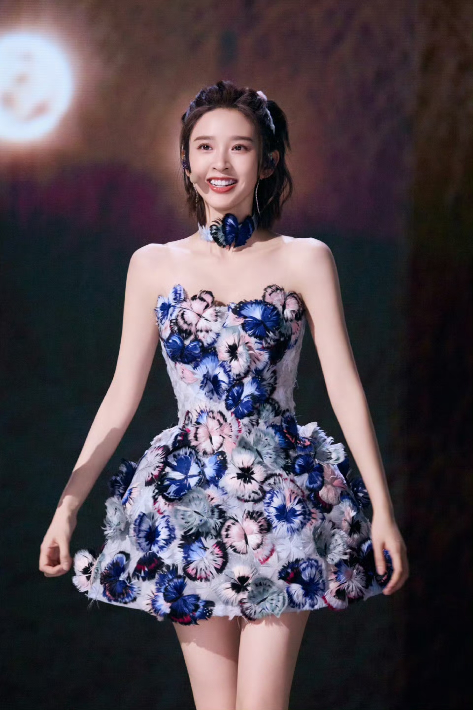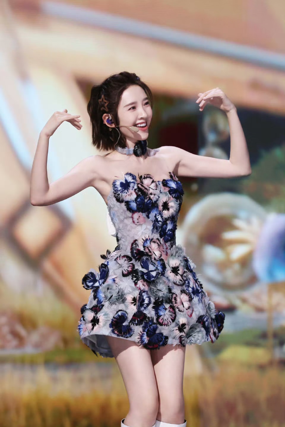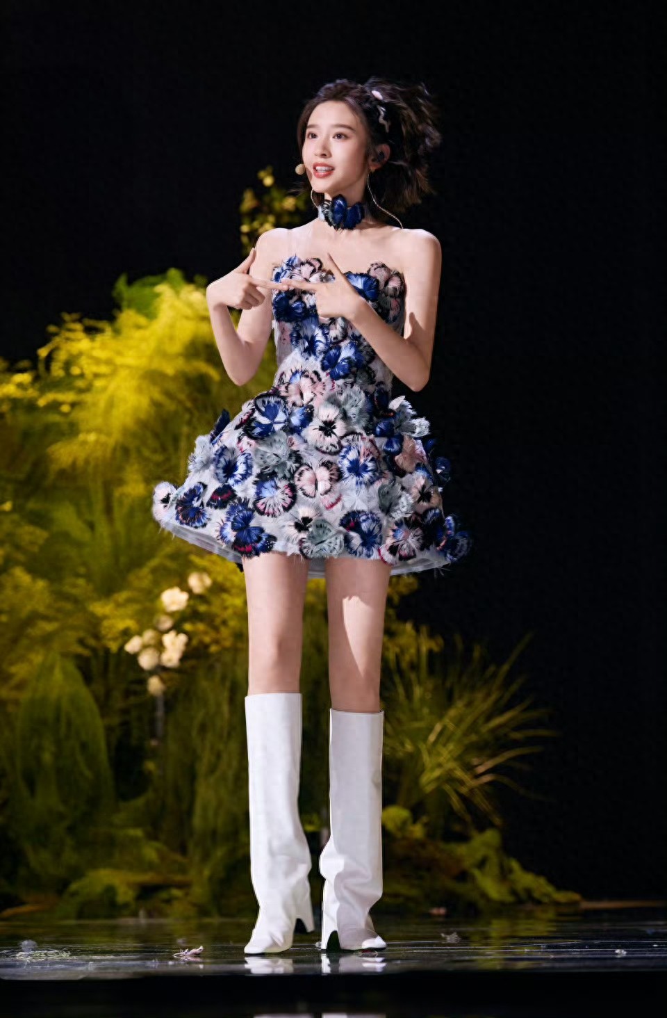 唐艺昕舞台上穿着白色筒靴,腿又长又直,自信又迷人