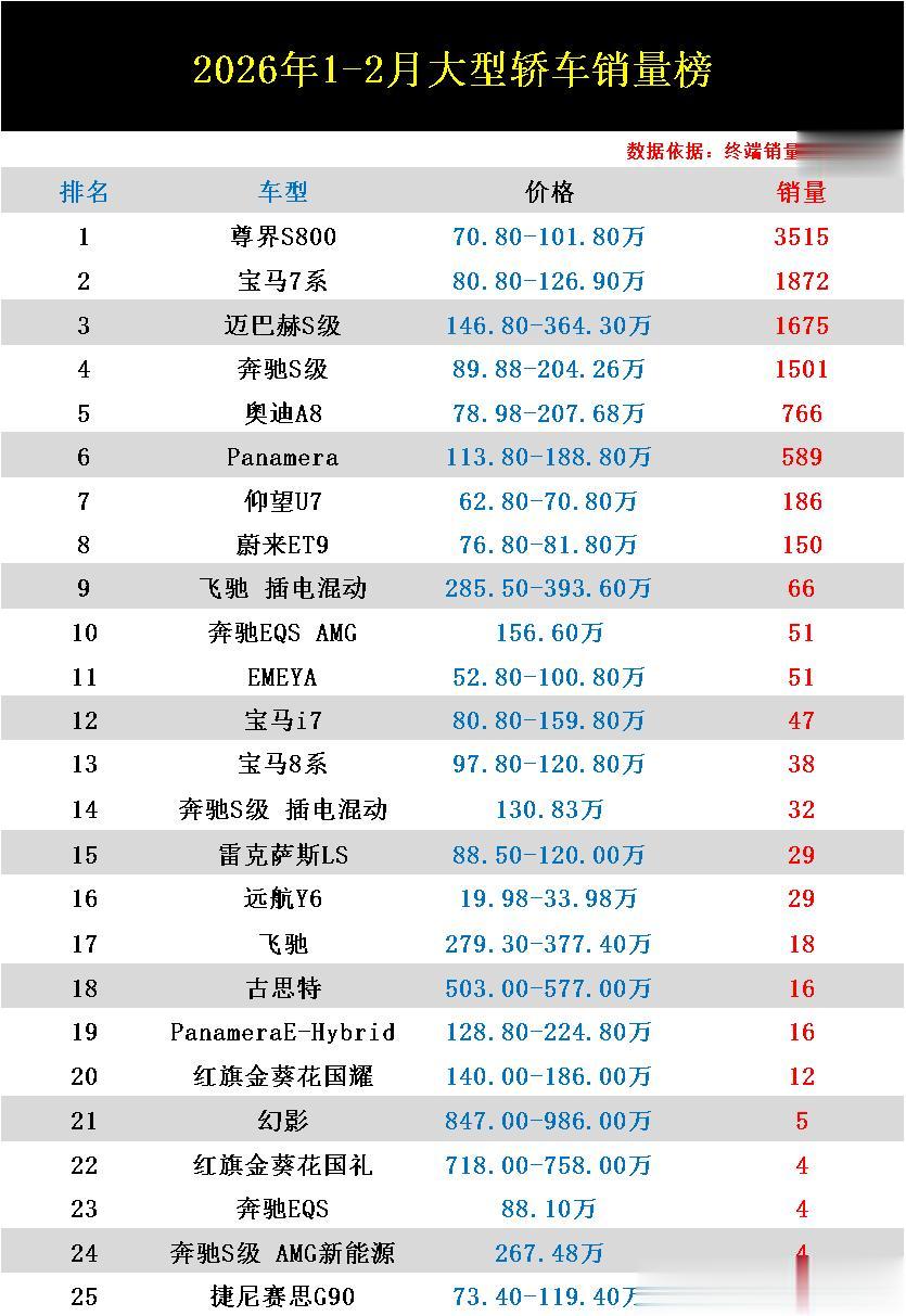 导读:不得不承认,随着新能源的爆发,国内各大汽车细分市场的销量排名已彻底变天,高端大型轿车市场也不例外。根据近期公布的2026年1-2月大型轿车销量排行榜数据显示,虽然外资与合资车型在这个细分领域仍然处于领先地位,但国产品牌车型凭借新能源的优势已然成为了市场销量增长的主力。其中尊界S800以3515辆的销量逆袭至榜首,仰望U7、蔚来ET9等车型也都在榜单前列中站稳了脚跟,排名均入围榜单前8名。而外资豪华品牌车型方面,整体市场统治力依然还在,宝马7系、迈巴赫S级、奔驰S级依旧是众多有钱人的首选之一。奥迪A8以及保时捷Panamera热度也都不减当年,1-2月累计销量均在589辆之上。真难!1-2月大型轿车销量榜:宝马7系丢冠,仰望U7第7,幻影第21