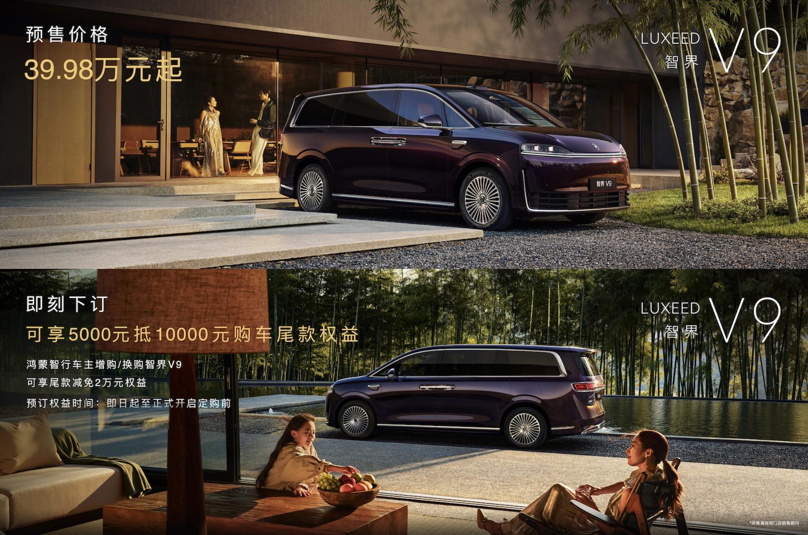 作为鸿蒙智行旗下首款旗舰MPV车型,智界V9由华为与奇瑞联合打造,官方定位为“MPV科技车皇”,预售价39.98万元起。预订可享5000元意向金抵10000元尾款,鸿蒙智行车主增换购可享尾款减免2万元权益。开启预售仅1小时,订单量便突破12500台。