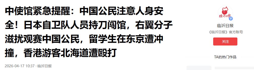 中日关系走到今天这一步,责任完全在日方。日本政府如果不能及时反思纠错,停止对华挑衅,认真处理针对中国使馆的系列恶性事件,保障中国在日人员的安全,那么双边关系很难回到正轨,而中国也会继续采取必要措施,坚定维护国家主权、安全与公民的合法权益,绝不会在威胁面前有任何妥协。对我们普通人来说,认清当前的风险,响应国家的提醒,暂时不去日本,就是对自身安全最基本的保护,也是对国家立场最直接的支持。