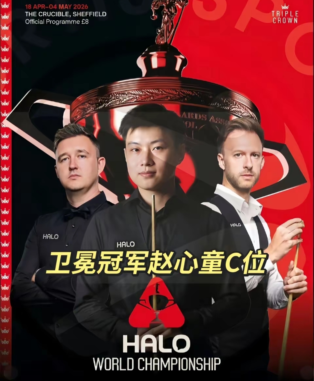 4月12日,斯诺克世锦赛公布官方海报,卫冕冠军赵心童位于“C”位,世界排名前2位的小特和冏哥,分列两侧。