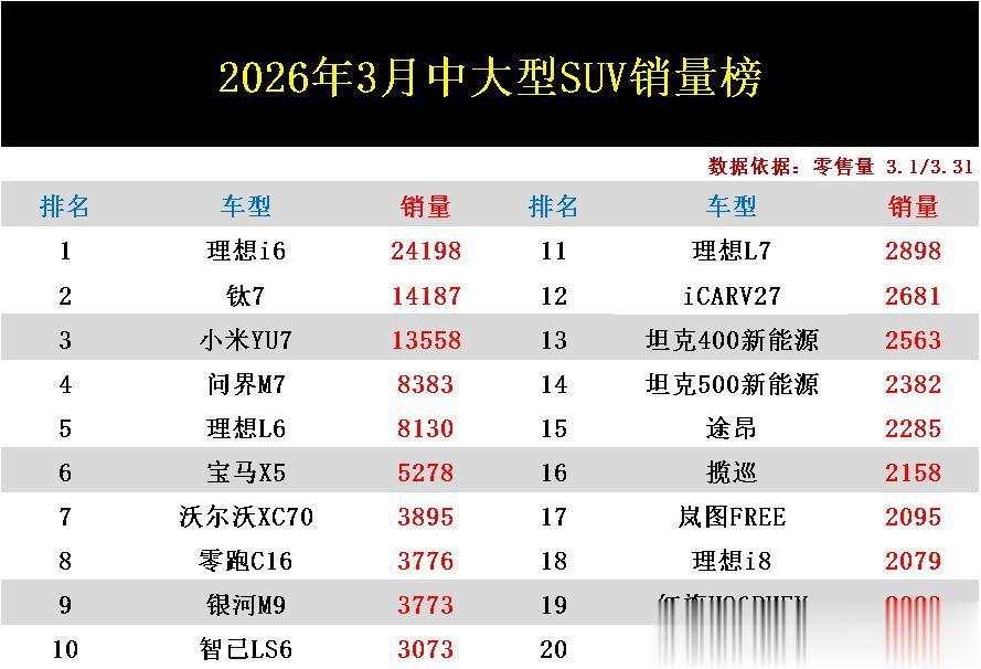 导读:刚翻看完2026年3月中大型SUV销量排行榜!给人的第一感觉就是这一细分的市场竞争格局又变天了!以往连续多月占据榜首的小米YU7蝉联冠军失败,理想品牌则凭借理想i6再次重回榜单巅峰,而同为理想品牌的L6增长势头也都十分明显,沃尔沃XC70首次杀入榜单前十。