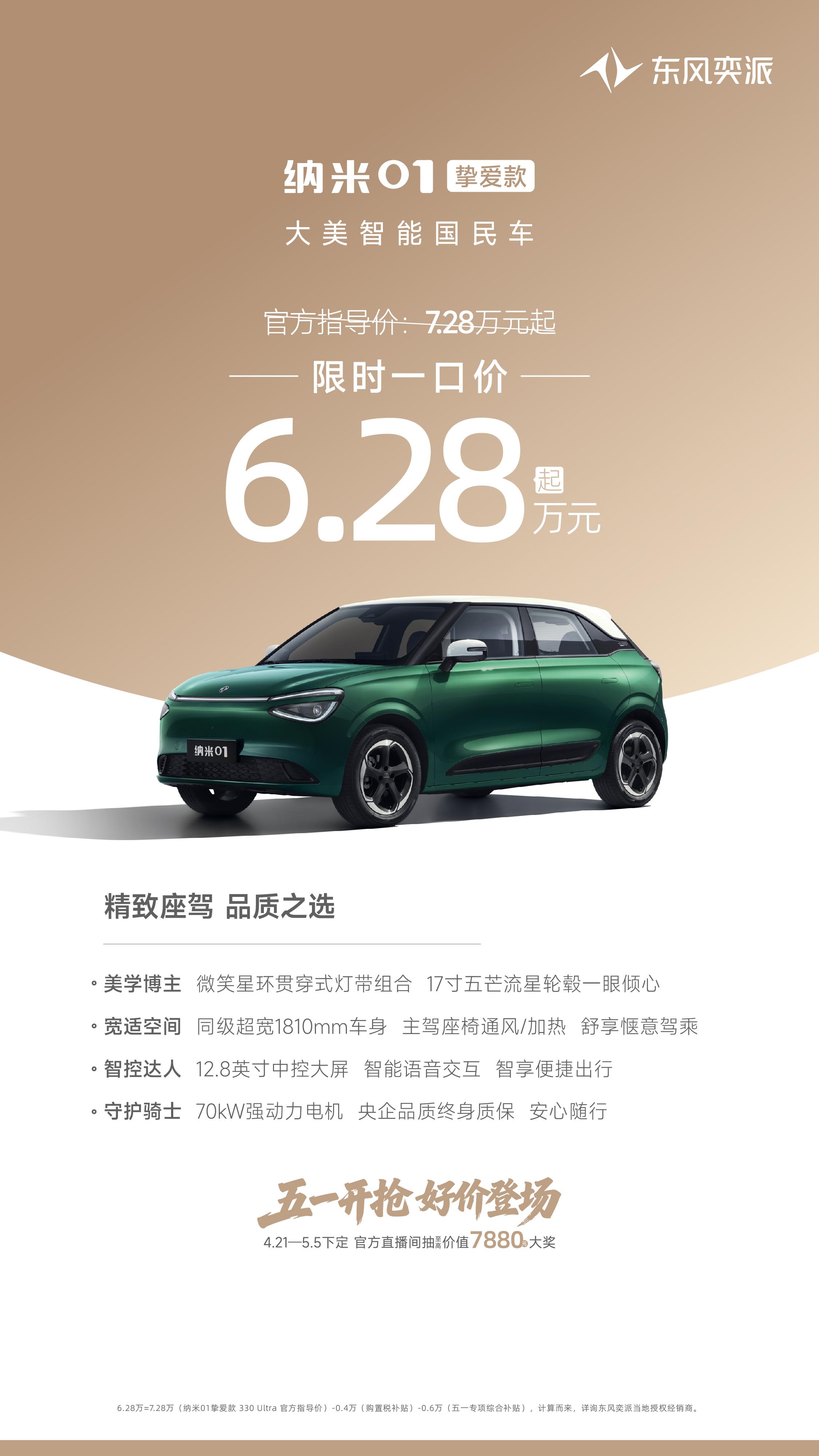 作为本次活动的核心亮点,东风奕派全系车型同步让利,无差别享受限时一口价福利,真正实现“全民可享、全民适配”。针对入门代步需求,“大美智能国民车”纳米01初心款限时一口价5.98万元起(不含330 Fly版),挚爱款6.28万元起,颜值与智能兼备,搭配3年5万0息金融政策,让年轻人轻松实现0压力购车,成为城市出行的时尚单品。