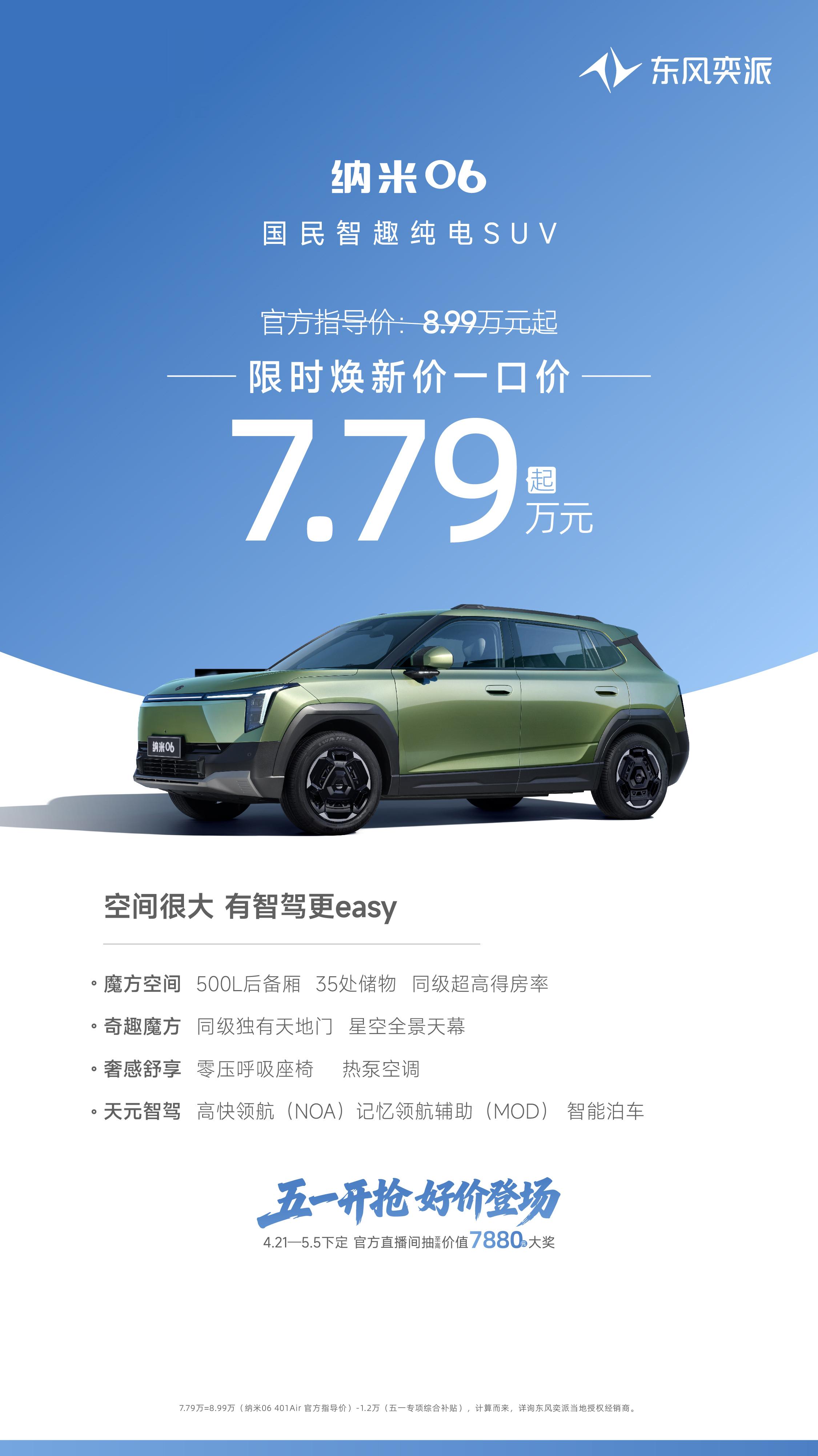 全民购车狂欢季,好车好价全覆盖!4月21日至5月5日,东风奕派“五一开抢,好价登场”限时活动盛大启幕,以全系车型限时一口价5.98万元起的诚意钜惠,搭配至高7880元大奖抽奖、多重金融福利,覆盖入门代步、城市通勤、家庭出行、个性轿跑等全场景出行需求,无论你是刚入社会的年轻人,还是追求品质的家庭用户,都能找到属于自己的高性价比座驾。