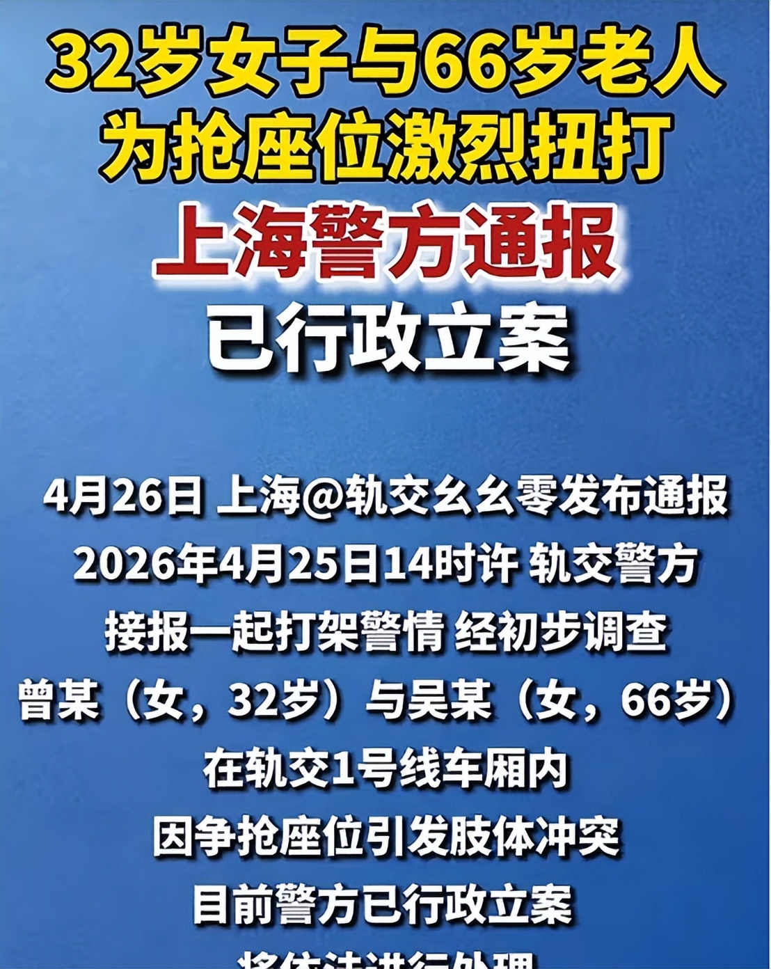 红星新闻 2026-4-26 上海警方通报“女子在地铁与老人激烈扭打”:曾某(女,32岁)与吴某(女,66岁)因争抢座位引发肢体冲突,警方已行政立案