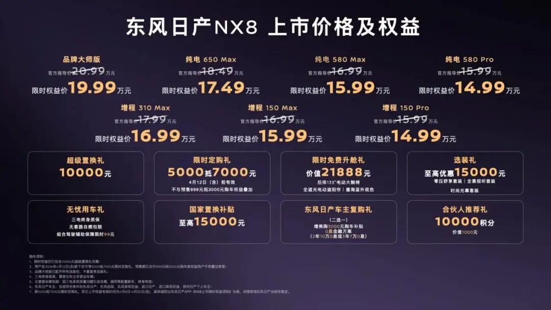 动力方面,NX8提供纯电与增程两个版本,官方指导价15.99万-20.99万元。叠加上市限时权益后,实际入手价为14.99万-19.99万元。