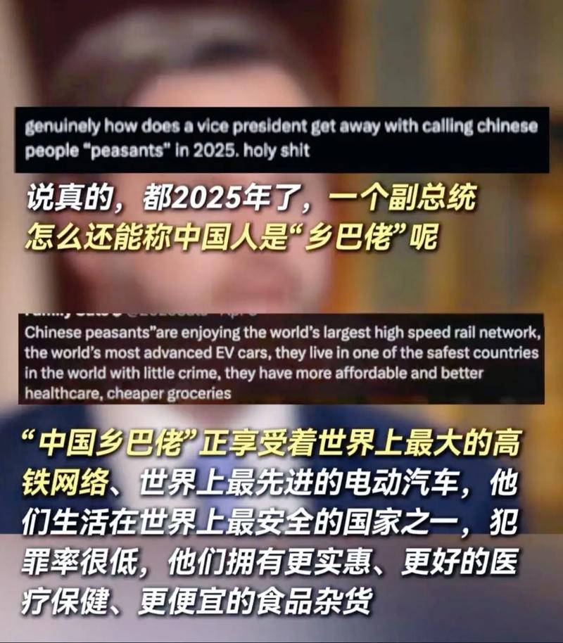 好家伙,这是21世纪,不是19世纪。万斯可能忘了,他嘴里那个“乡巴佬”国家,高铁里程占全球三分之二,量子计算机“九章”把美国甩在后面,空间站都自己建起来了。你管这叫乡巴佬?