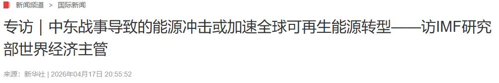 4.2026.04.17-《专访|中东战事导致的能源冲击或加速全球可再生能源转型——访IMF研究部世界经济主管》-新华社