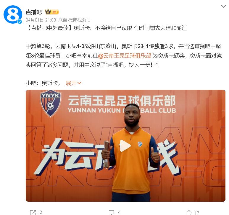 这场比赛表现最抢眼不是克雷桑,也不是泽卡,更不是卡扎伊什维利,而是被称为玉昆战神的奥斯卡,他2射1传独造3球,当之无愧当选最佳球员,开场不到2分钟,他就助攻卡约闪电破门,瞬间让云南玉昆球迷坐不住了,这个进球太快了吧!他的表演还没有结束,为什么这样说?