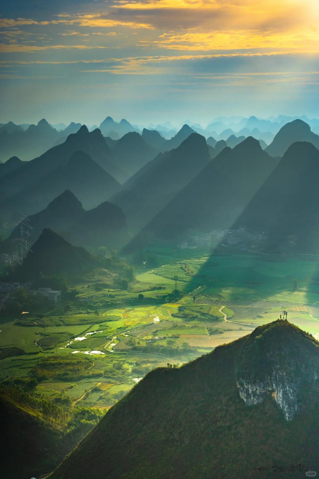 四周几百座喀斯特山峰,就跟商量好似的,齐刷刷地立在你脚下。左江像一条碧绿的绸带,在峰林里绕来绕去。夕阳的余晖把整个天地都染成了金色,那一刻,风声很大,但我觉得世界特别安静。
