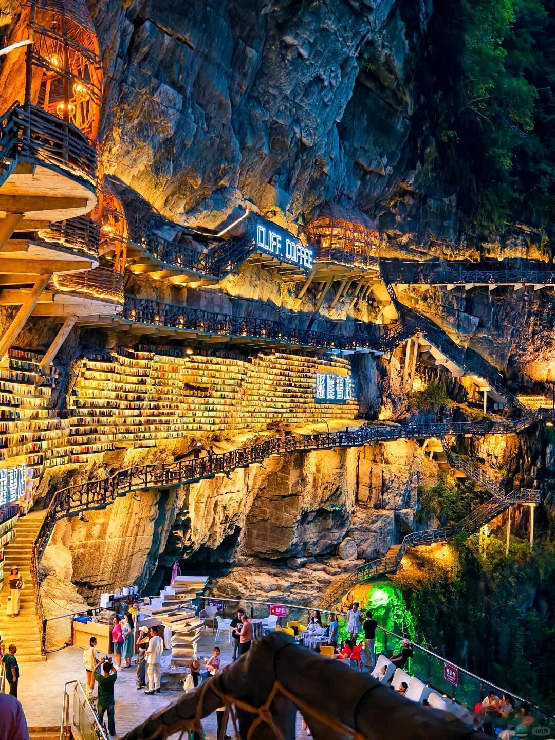 我是误打误撞走进去的。外面太阳晒得人发蔫,踏进这个岩洞书店,瞬间凉快了。天然的岩壁,摸上去又凉又滑,带着喀斯特地貌特有的质感。空气里飘着咖啡香和书页的味道。