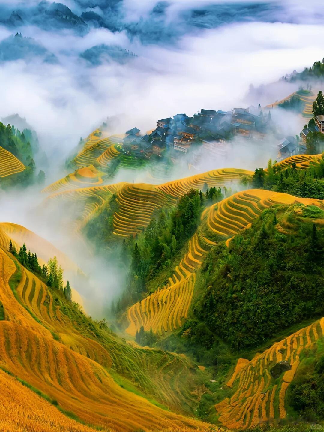 从山脚到山顶,一层一层,一圈一圈,全是水光闪闪的梯田。灌满了水的梯田,像千万面碎镜子,把天空的光都反射回来。当地人说,这是壮瑶两族先民,花了六百多年,一锄头一锄头开垦出来的。