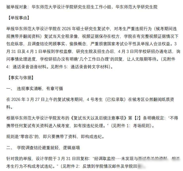 2026年春天,华东师范大学设计学院考研复试刚刚结束,一名39岁的男考生笔试成绩落后,复试排在第二名,总分数差了一位没能录取,这名考生当场举报了综合成绩第一的应届生,指出对方在候考室里翻看纸质资料,属于违反考试规定。