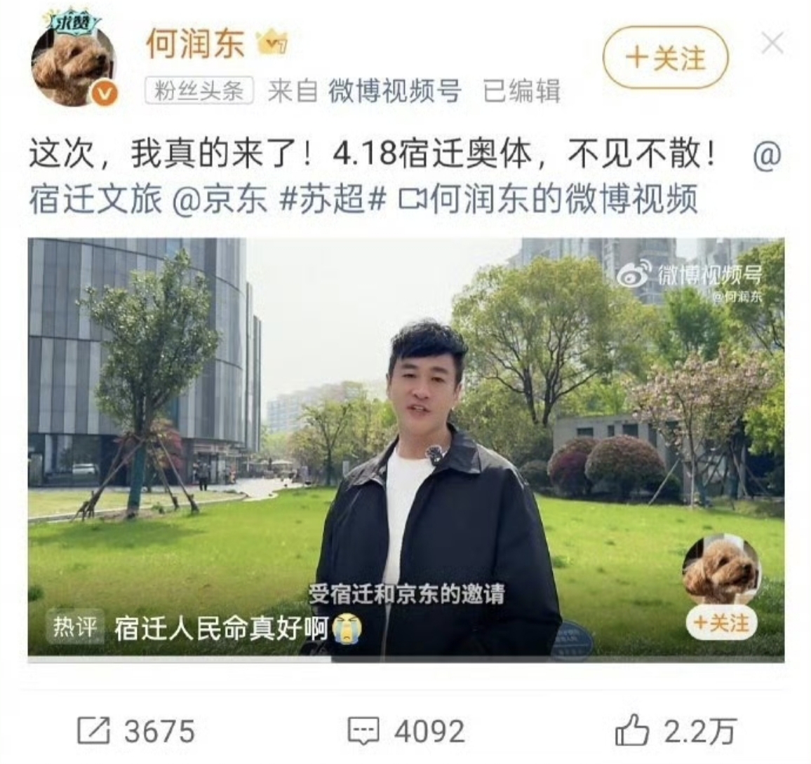 4月18日,何润东身披20斤重的复刻版霸王战甲,空降"苏超"宿迁队主场,驾着仿古战车绕场,三声"宿迁子弟何在"点燃全场,直接冲上6亿阅读量。 宿迁文旅这波"听劝营销"也被网友封为"史上最听劝的文旅局"。