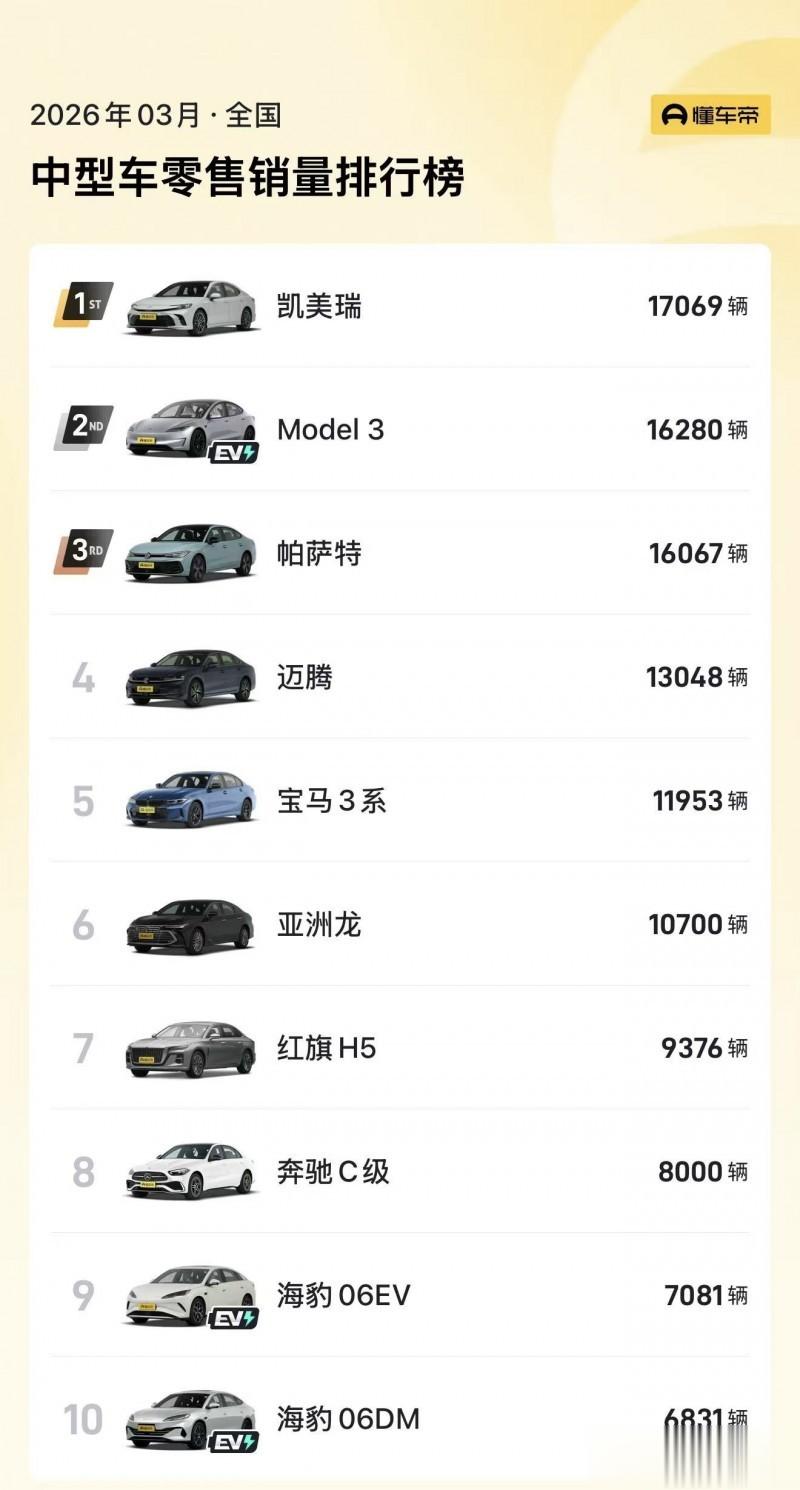 中型轿车领域,凯美瑞的地位依旧稳固,3月以17069台的销量登顶销冠,连续二十多年畅销全球的成绩,让它积累了海量忠实用户。多年来,凯美瑞在平台技术、动力系统、安全配置等方面不断迭代升级,依托成熟的工业生产体系,实现了产品力的持续提升,这款车的综合表现均衡,无论是日常通勤还是长途出行,都能满足大多数消费者的需求。