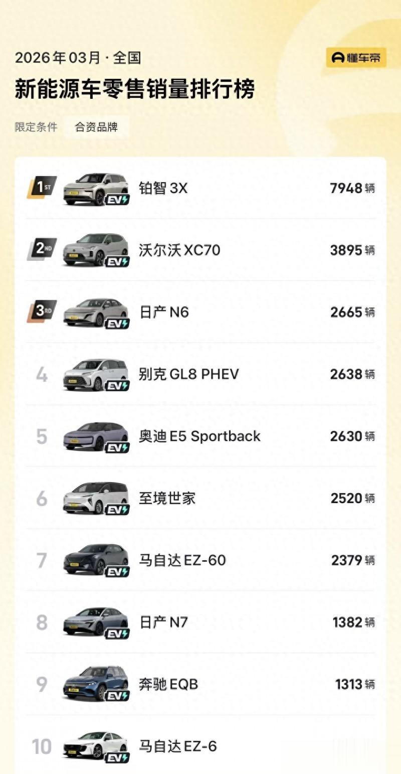先看合资新能源市场,铂智3X绝对是今年的热门车型,3月销量达到7948台,不仅拿下本月合资新能源销冠,更实现了连续7个月蝉联。从工业科技层面来看,这款车的持续领跑,离不开广汽丰田在新能源技术上的持续研发与突破,稳定的性能输出、可靠的品质把控,都是其技术实力的直接体现,对于注重节能、信赖合资品质的消费者来说,这款车的稳定表现是合资新能源市场的优选,销量就是最好的口碑证明。