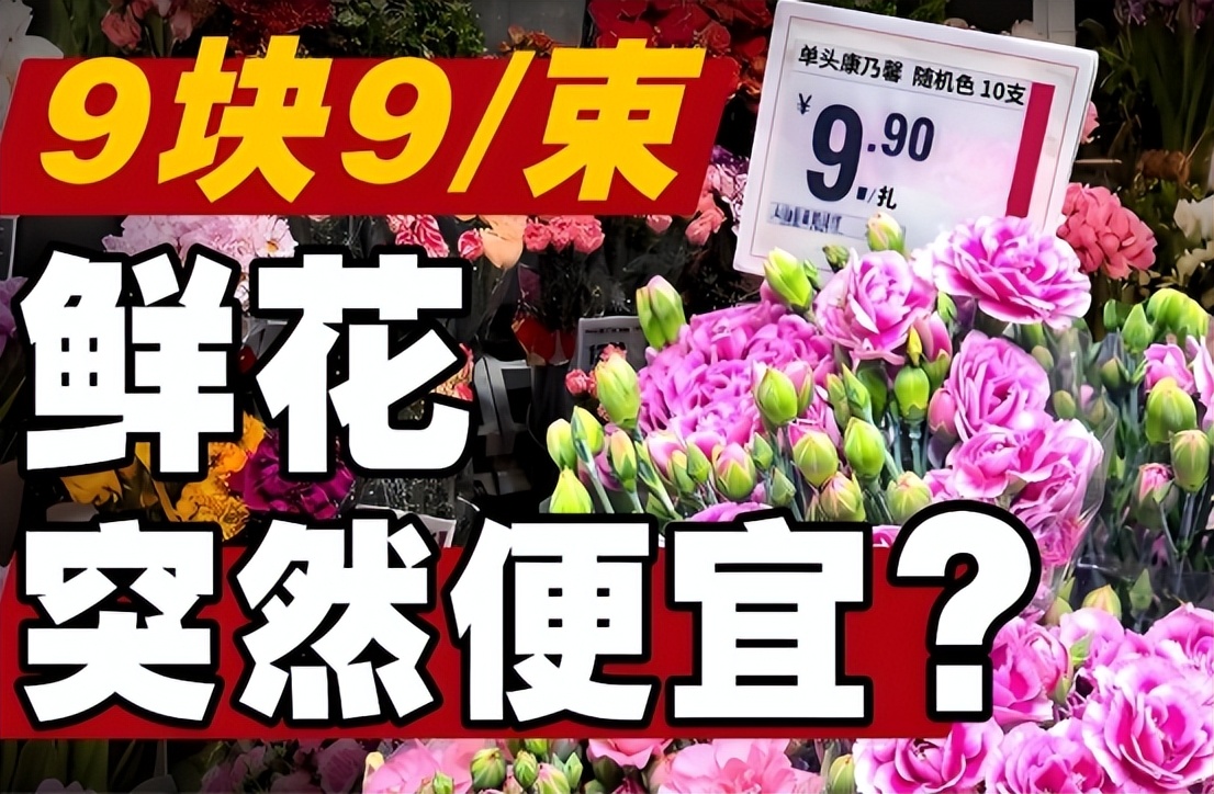 9块9一束的玫瑰和康乃馨,在街边和外卖软件上随处可见,印象里的高价礼品,一夜之间变成了日常快消品,甚至比一杯咖啡还便宜。