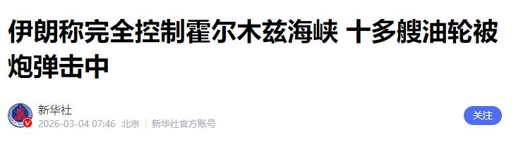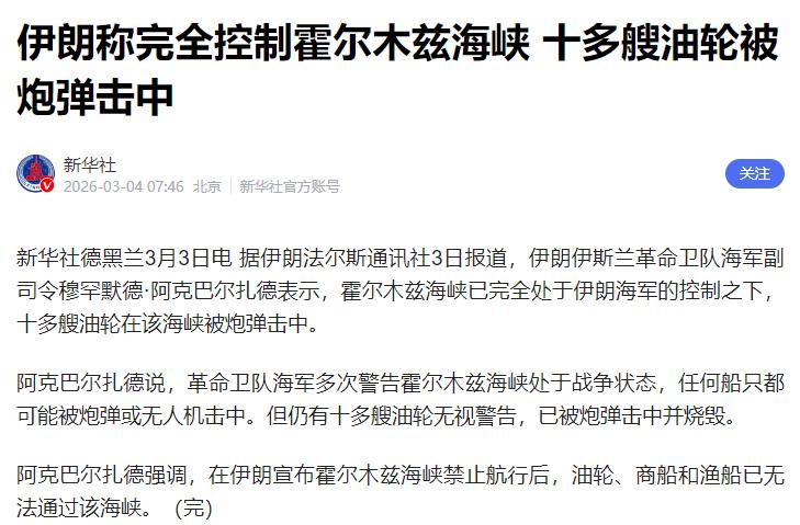 伊朗海军副司令明确表态,已完全掌控该海峡,不听警告的船只皆可能被打击。