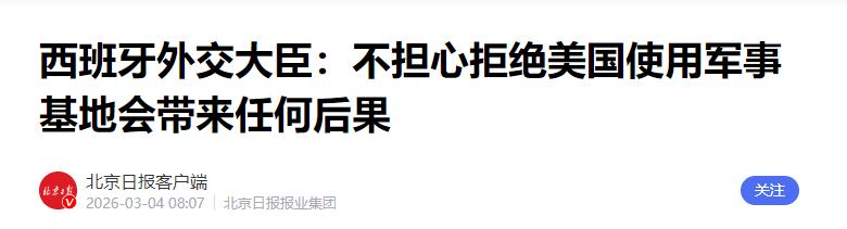 西班牙明确表示,美以行动未获国际认可,且伊朗已将美军基地纳入打击名单,开放基地等同于引火烧身,不愿为美国冒险。