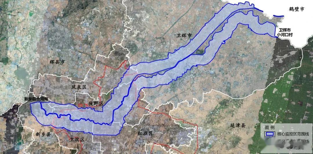 • 大运河新乡段核心监控区(2000米):卫河新乡段(新乡县合河闸-卫辉市小河口村,河道全长约75千米)两岸各2千米范围。