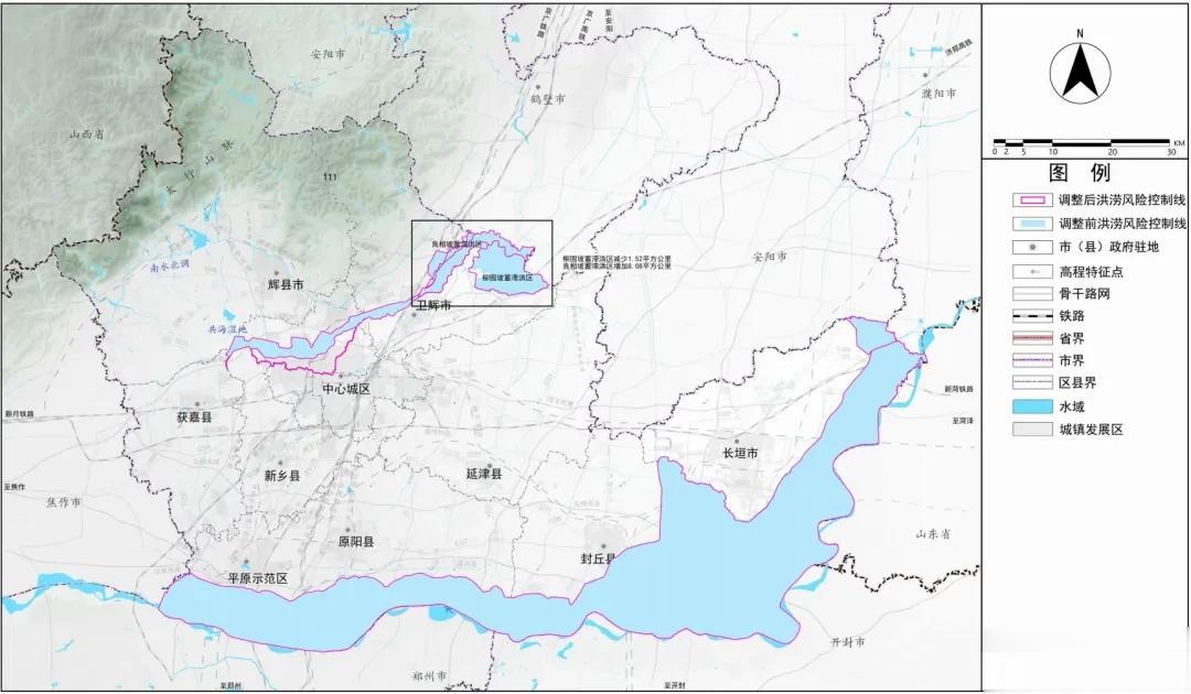 洪涝风险控制线:以国家、省最新蓄滞洪区划定与管控要求为依据,结合新乡市洪涝风险特征与流域防洪格局,以良相坡、柳围坡两大蓄滞洪区最新划定成果为核心,对洪涝风险控制线进行系统性更新与刚性校准。