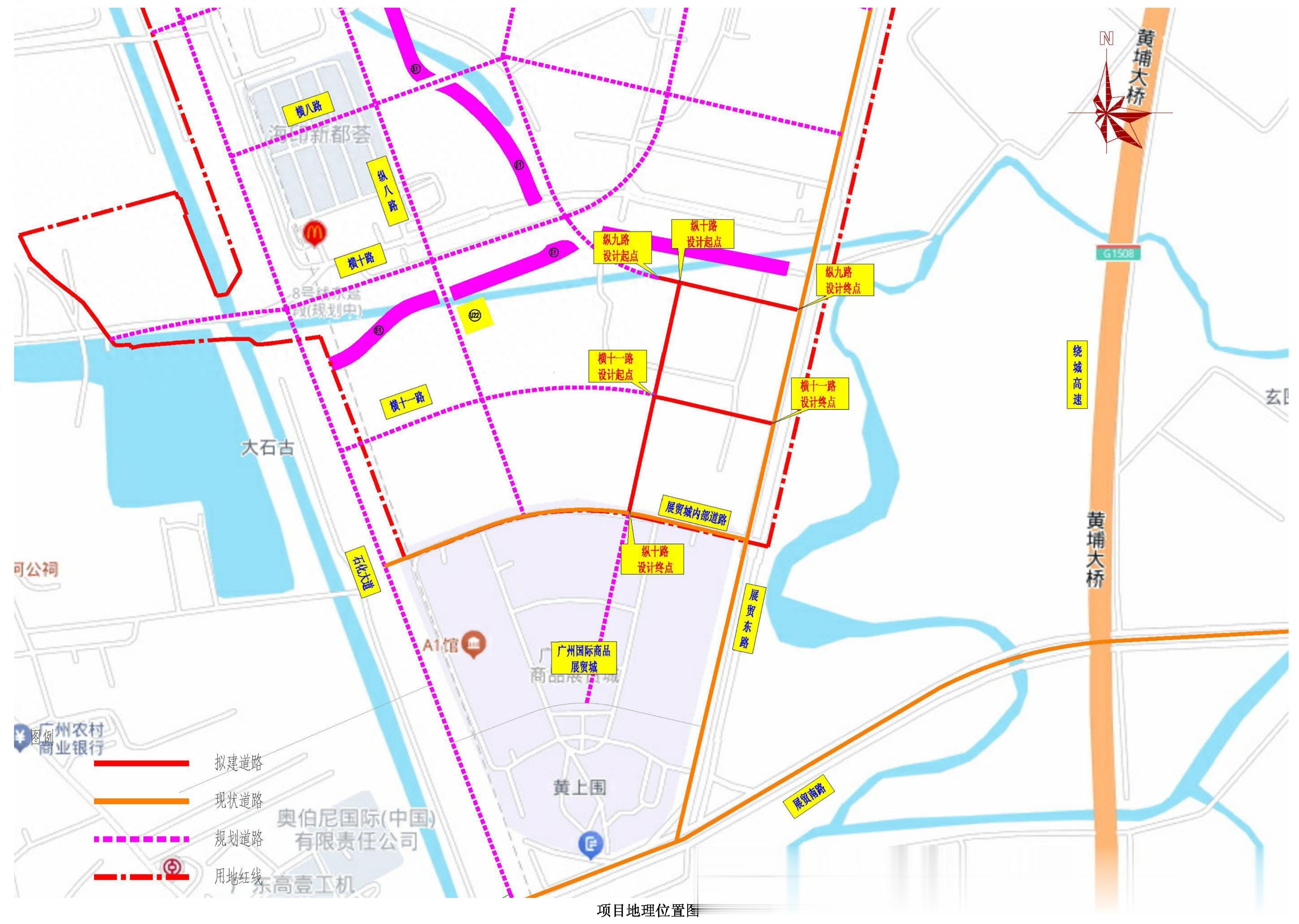 本次新建三条路位于广州市番禺区广州国际商品展贸城以北,南大干线以南,展贸东路以西,项目包含三条道路。