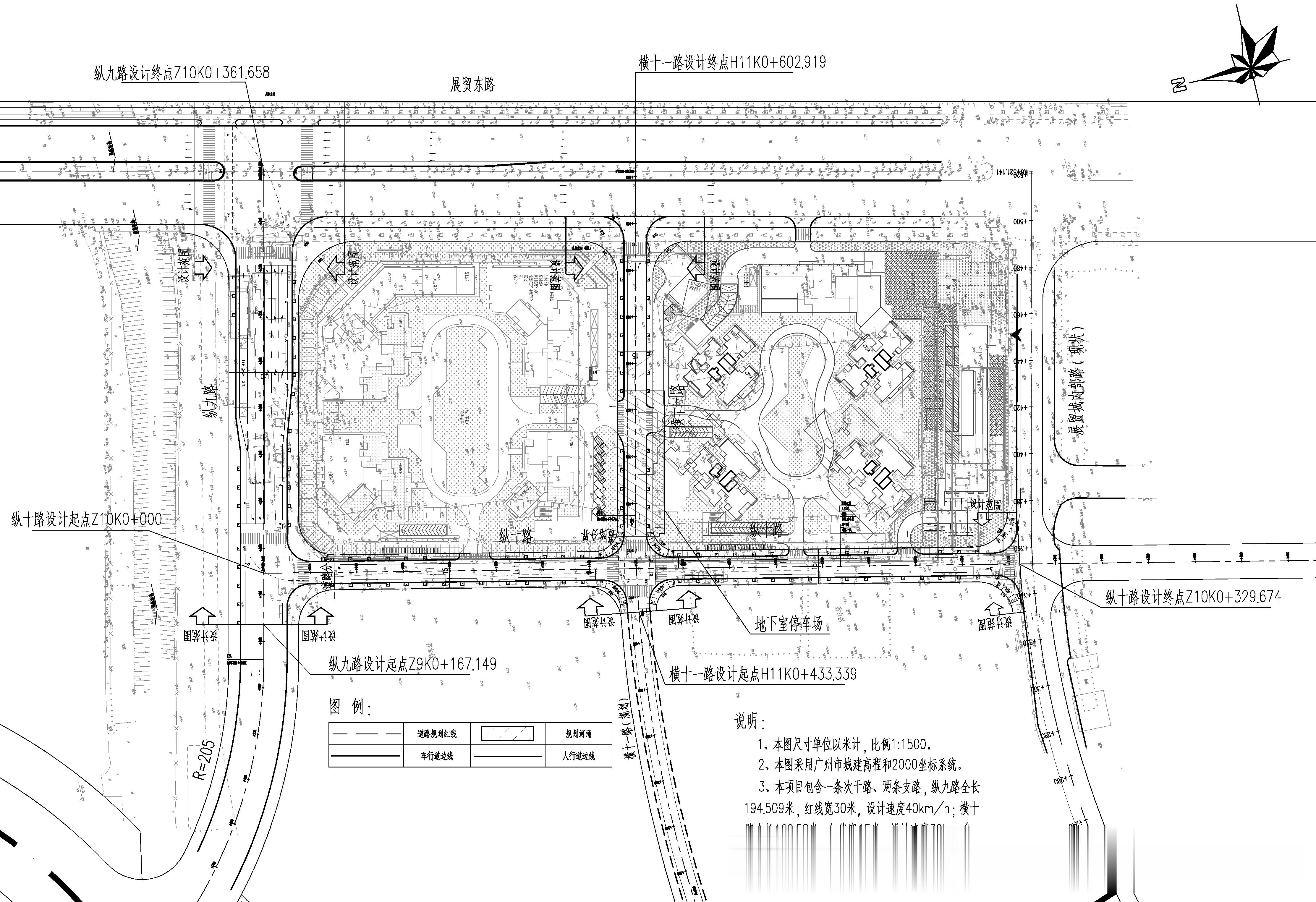 (一)规划纵九路:道路等级为城市次干路,西起现状河涌东岸,东至展贸东路,全长194.509米、道路红线宽度30米,双向4车道,设计速度为40km/h。