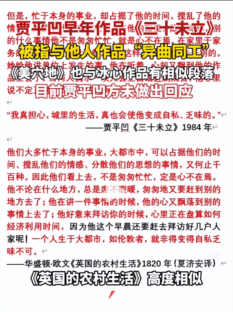 起初,举报人瞄准的是贾平凹本人,指控他的《美穴地》抄袭冰心,说实话这个指控如果坐实,就不只是“文坛丑闻”四个字能概括的了。