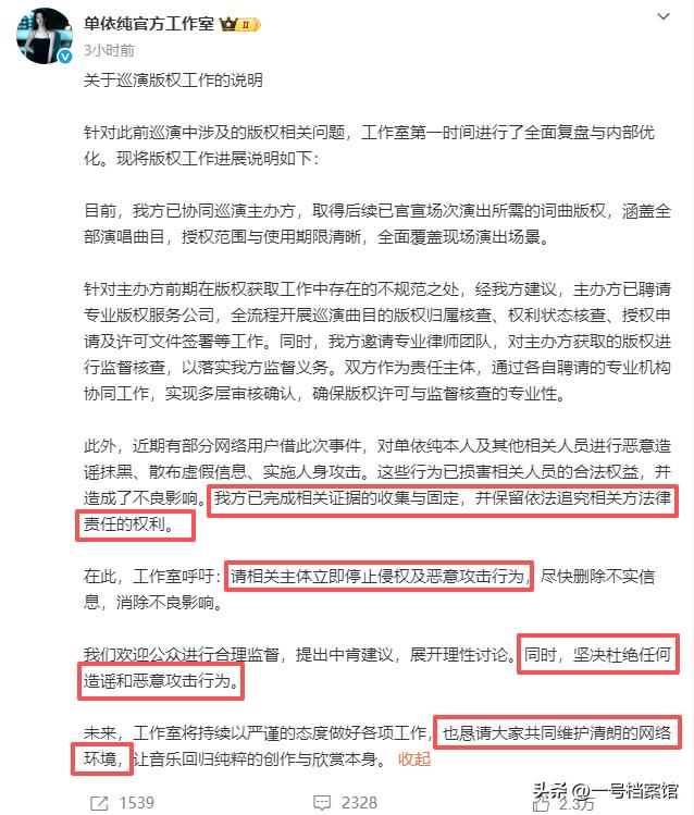 没想到单依纯侵权的是事情过去十多天了还有后续,就在4月12日工作室发文。