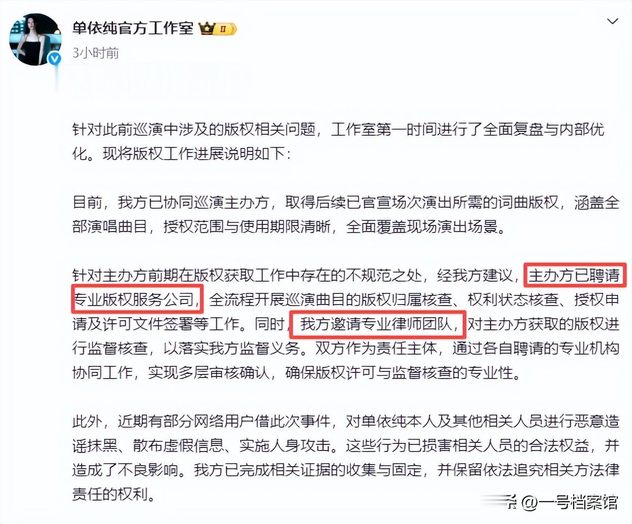 而单依纯这边采取的动作则是委托专业团队,主办方已经搞到的版权进行核实监督。
