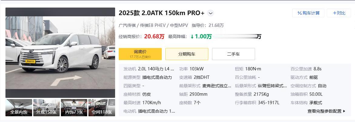 这几年,汽车市场的变化可真不小,新能源车越来越受大家欢迎,尤其是 MPV 车型,特别适合一大家子出行。在众多新能源车中,2025 款传祺 E8 PHEV 挺引人注意的,就一款 2.0ATK 150km PRO + 车型,官方指导价 21.68 万元。接下来,咱就详细唠唠这款车。