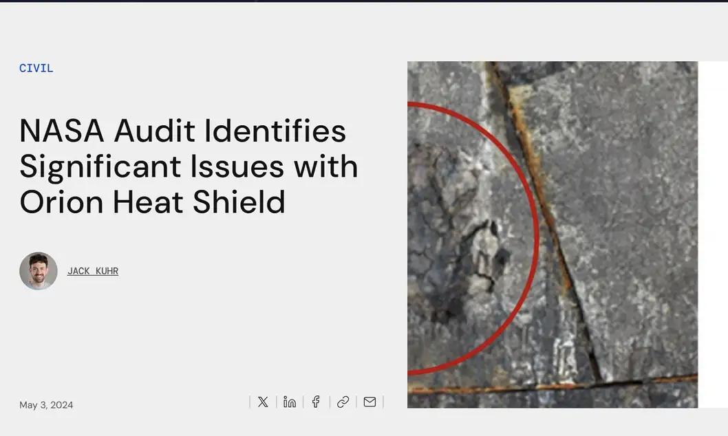 猎户座飞船使用的是Avcoat隔热盾,这种材料在阿波罗时代用过,按理说很成熟。