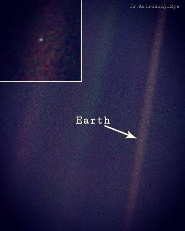 “在这个小点上,每个你爱的人、每个你认识的人、每个你曾经听过的人,以及每个曾经存在的人,都在那里过完一生。这里集合了一切的欢喜与苦难,数千个自信的宗教、意识形态以及经济学说,每个猎人和搜寻者、每个英雄和懦夫、每个文明的创造者与毁灭者、每个国王与农夫、每对相恋中的年轻爱侣、每个充满希望的孩子、每对父母、发明家和探险家,每个教授道德的老师、每个贪污政客、每个超级巨星、每个至高无上的领袖、每个人类历史上的圣人与罪人,都住在这里——一粒悬浮在阳光下的微尘。”