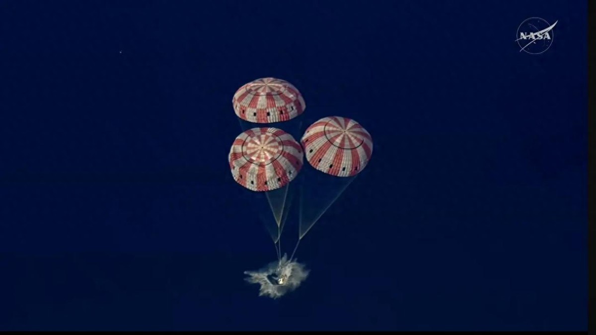 天空中,三个降落伞猛然张开,拽着刚刚飞临月球并返回的猎户座飞船,缓缓溅落在海面,搜救船只随之聚拢,登船。