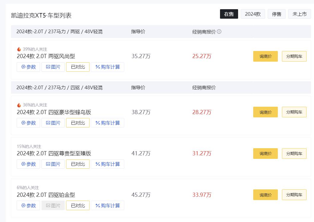 作为一台豪华中型SUV,凯迪拉克XT5实际上日子并不好过,从2月份公布的销量数据来看,只卖了1010台。车辆指导售价在35.27~45.27万之间,不过最近价格迎来了调整,全系4款车型都是直降10万元,对于想买凯迪拉克的朋友来说,会是一个好消息。