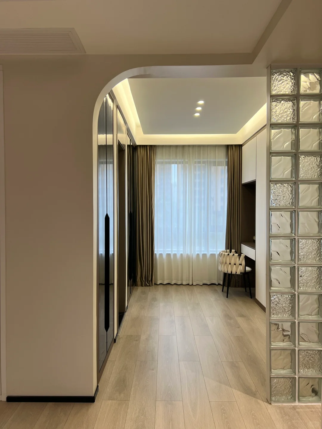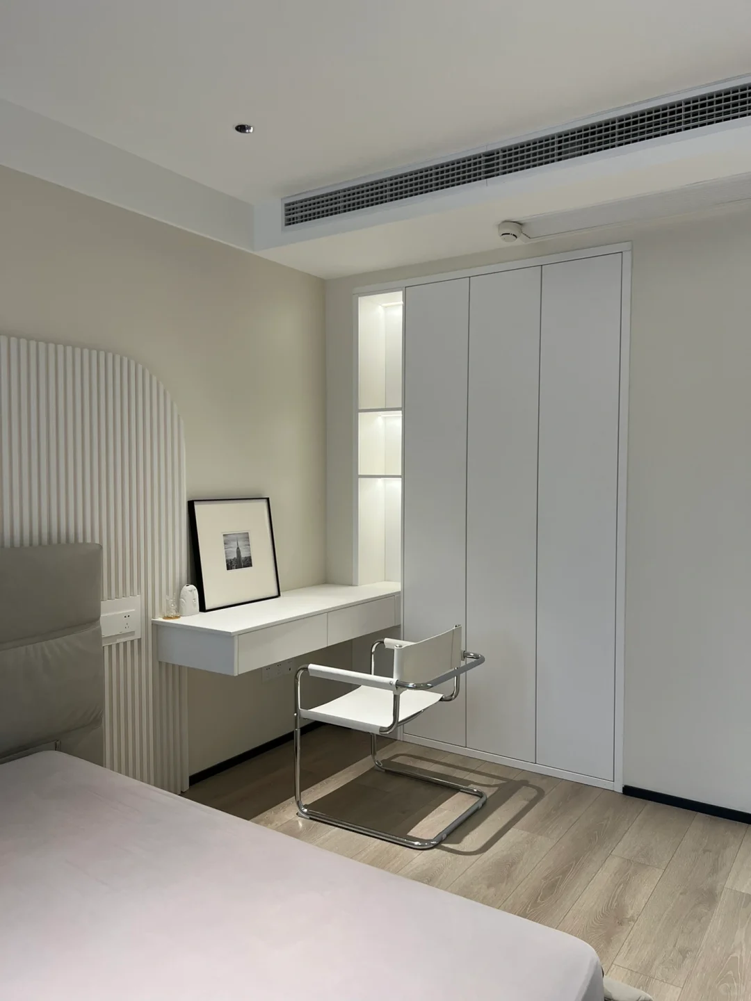 当时20年开始装修那会,正流行岩板背景墙+格栅。虽然当时正流行,但是总担心造型过于复杂,容易过时,所以就选择了简单的木作造型。果然到现在都看不腻~