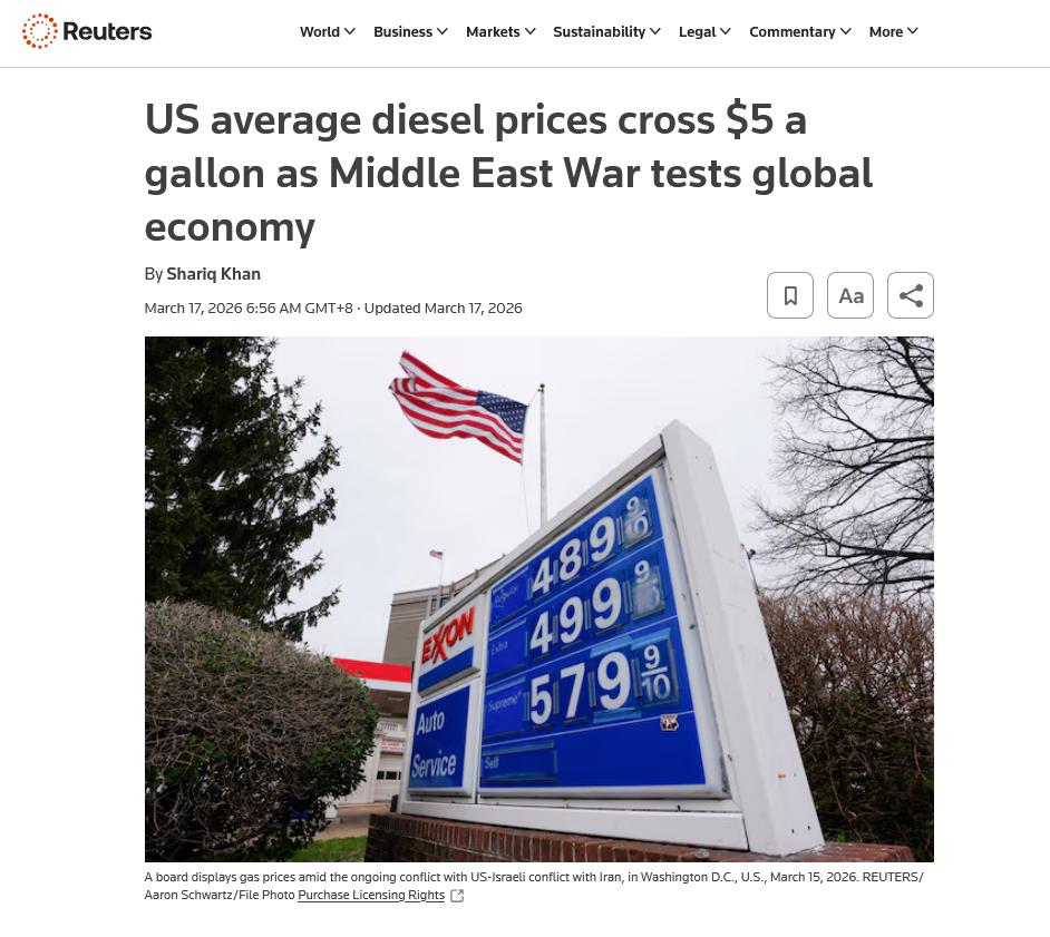 (美国柴油的平均价格已经超过5美元每加仑,将推高美国的物流成本)