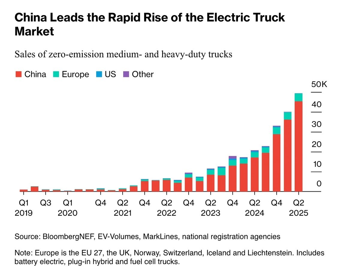 (2025年中国新能源重型卡车的市场占有率也超过了50%)