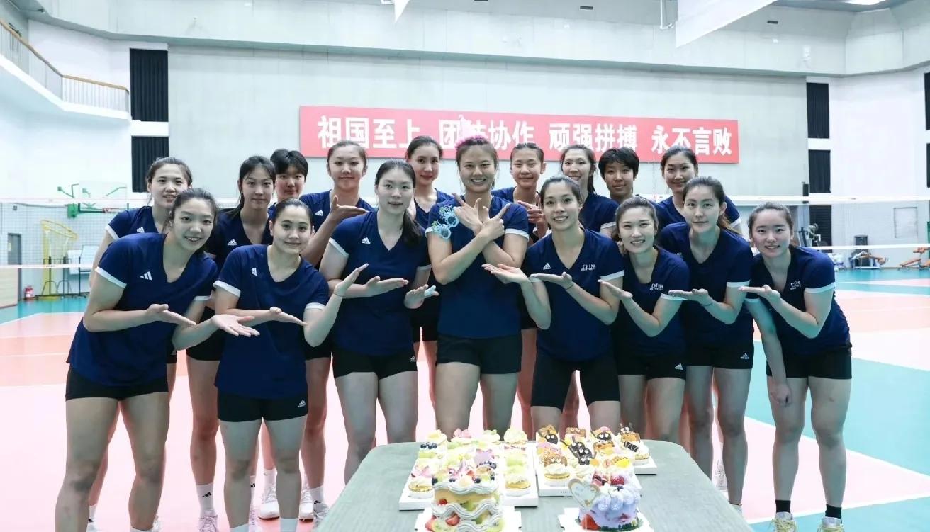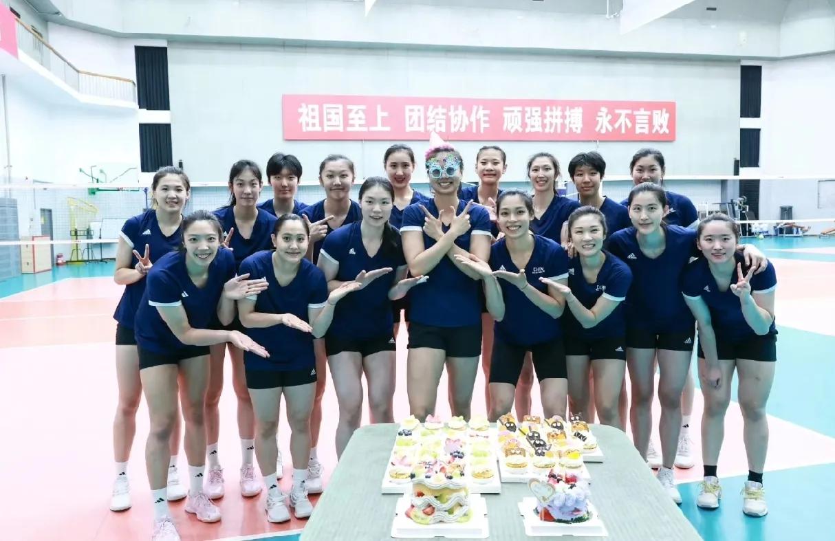 照片是在中国女排的训练场上拍照的。前面摆着生日蛋糕,接应龚翔宇今天过生日站在队员中间。左边是主攻唐欣自由人朱星辰二传张子萱,右边是主攻庄宇珊自由人王梦洁二传刁琳宇自由人倪非凡。