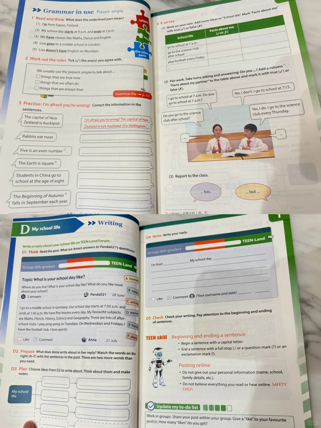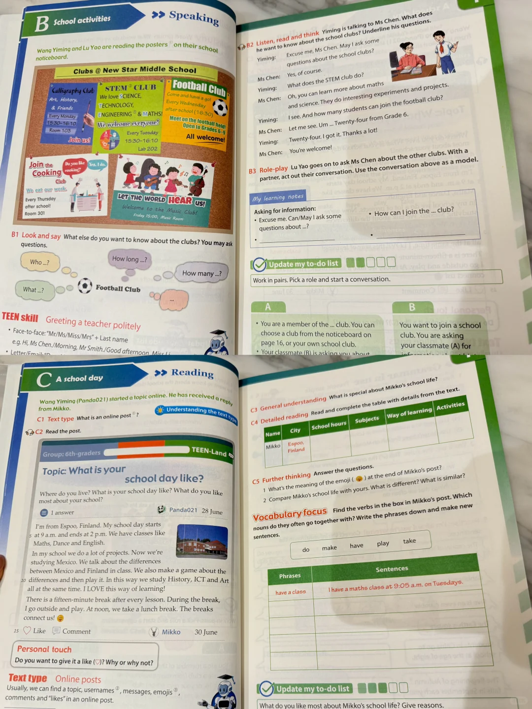 可以看到每一个单元的封面都很接近,基本就是本课的标题和一些引入的“热身”问题。新教材每单元上课前还新颖设计了“to do list”,方便小朋友做预习,接下来每一单元都分为ABCD四个part: