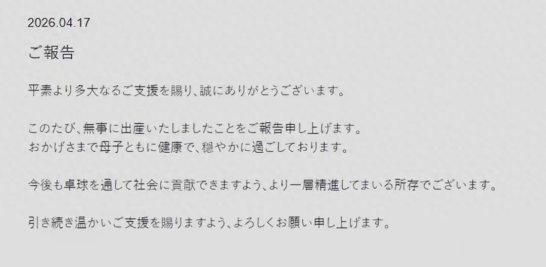 4月17日,已经生产有一段时间的福原爱,更新社交媒体动态,宣布三胎孩子出生,透露母子平安,目前状况良好,已经投入到工作状态。
