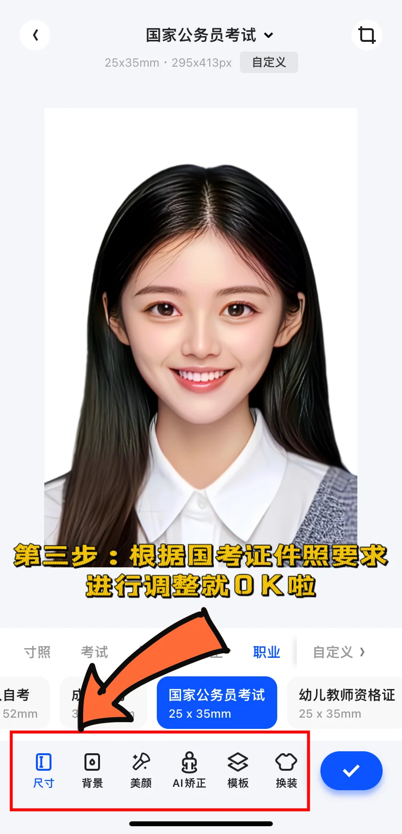 [向右R]这里学姐推荐一款好用的夸克扫描王APP,夸克扫描王内有专门为考公人准备的【国家公务员考试】尺寸规格,可以直接使用来拍证件照,不需要外出,在家就可以轻松get符合要求的国考报名照片,还能修饰皮肤、磨皮、祛痘、美白,在证件照中展示最完美的一面当然作为国考报名照片,不要过度美颜哦!还能用夸克扫描王来扫描所需要的证件,证件正反面扫在同一页,可添加水印防他用,