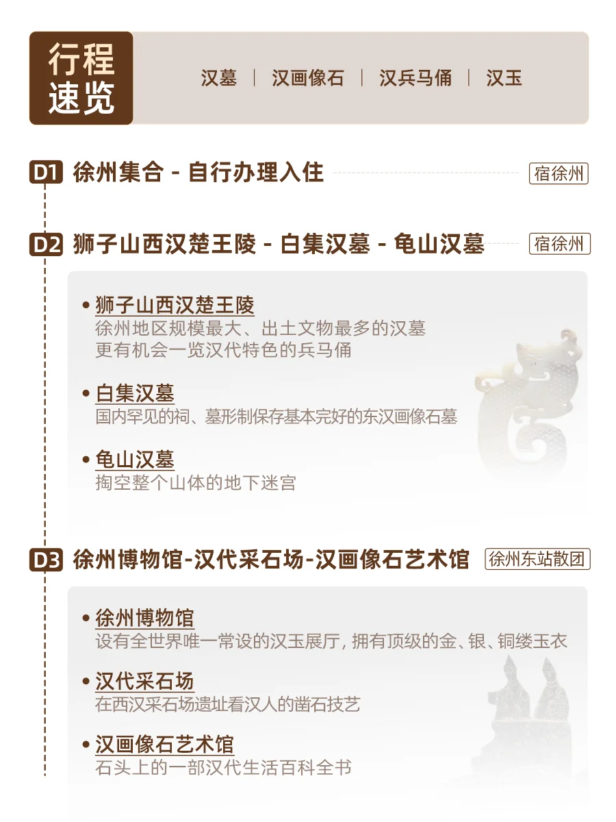 一个周末,3个代表性汉墓,2个重磅博物馆,让你在两天时间内,通过汉墓、汉兵马俑、汉画像石看两汉时期事死如事生的生死观、直面汉代先民生活的烟火气、欣赏汉代百工的惊人匠心