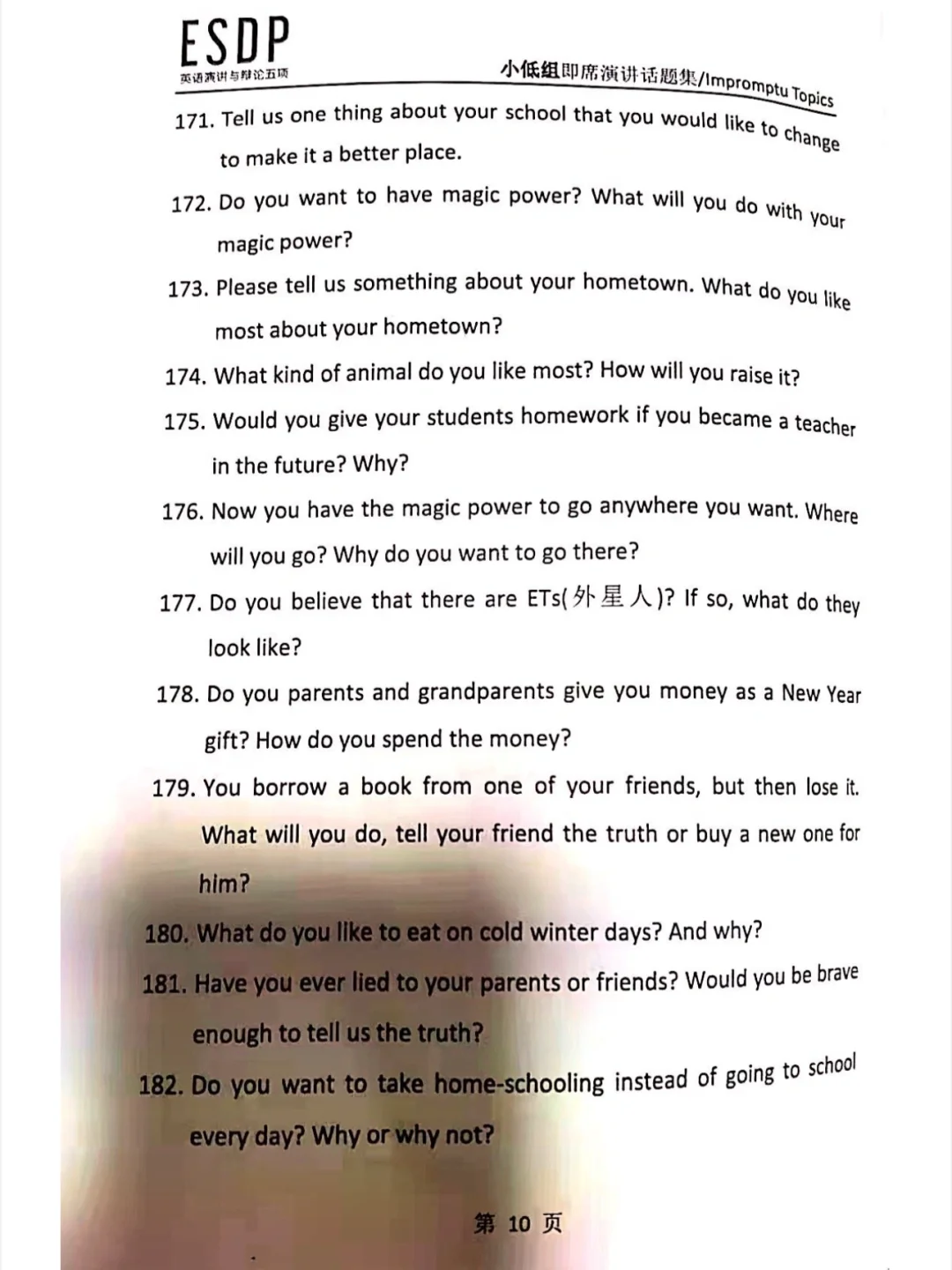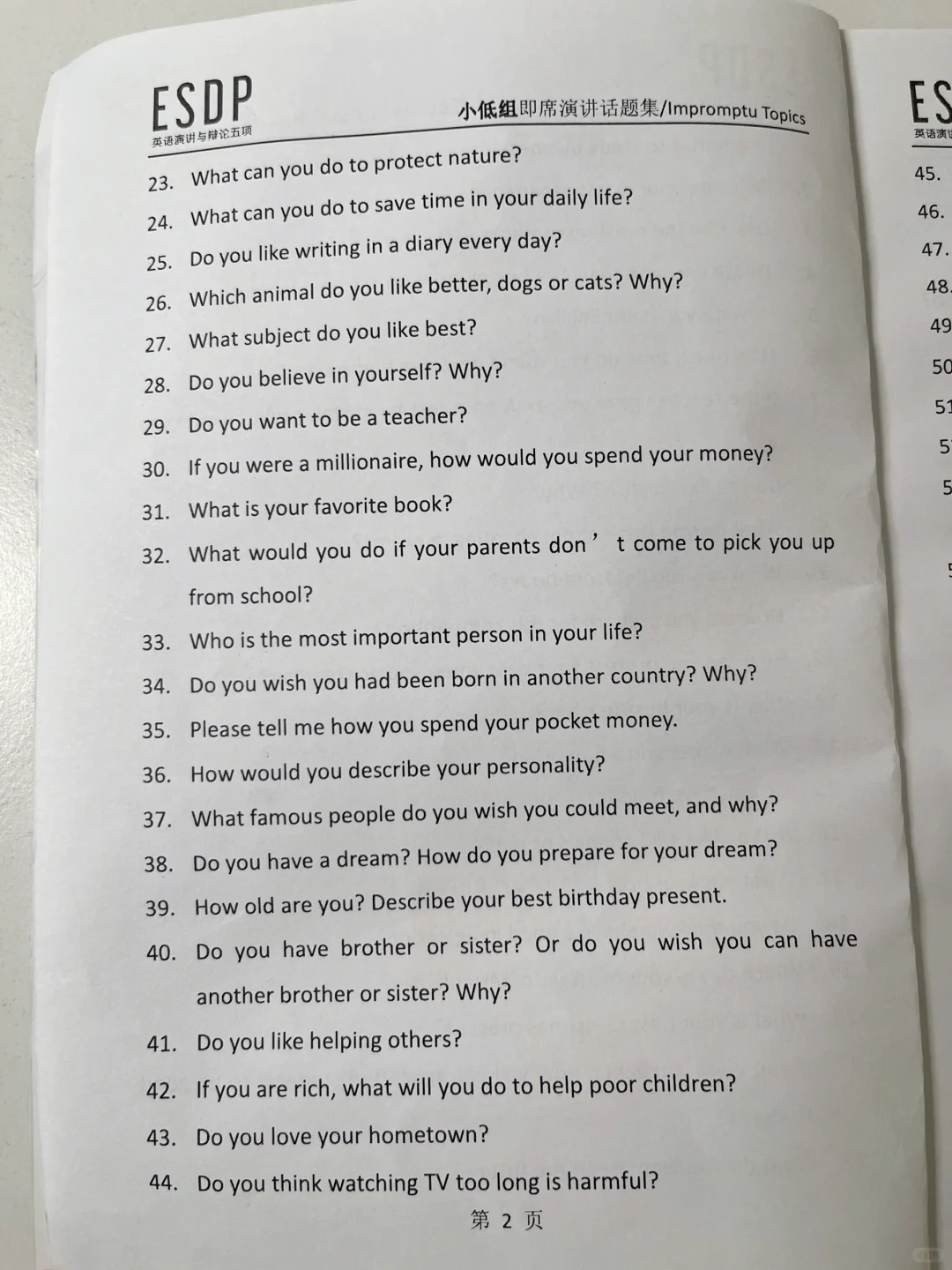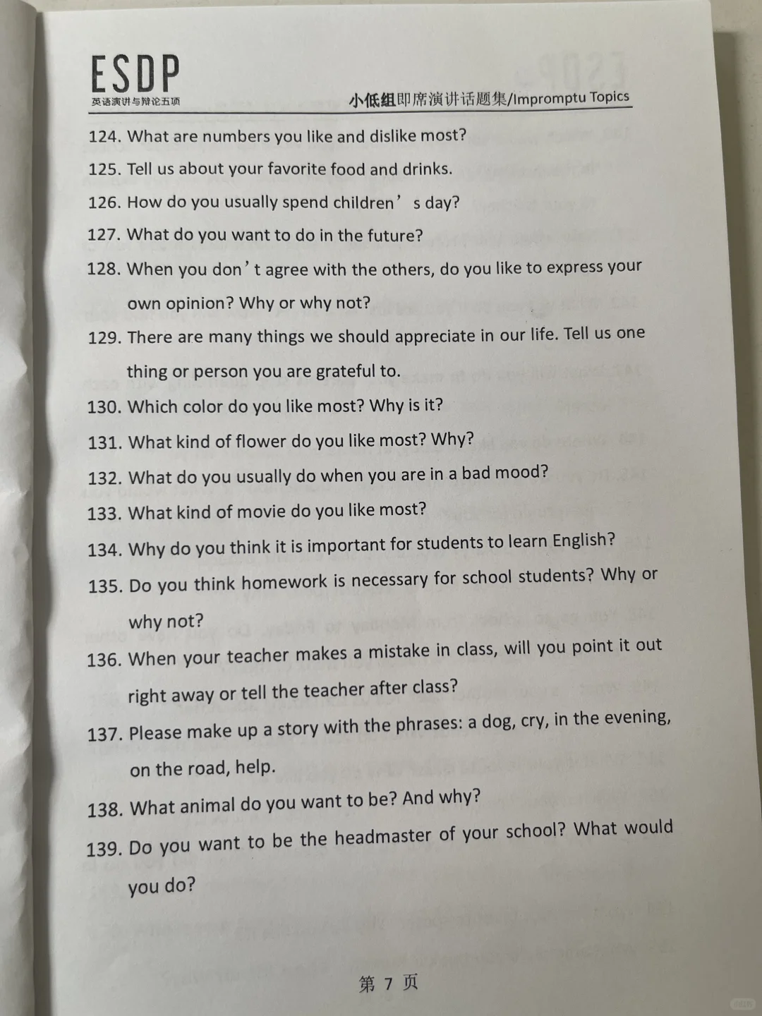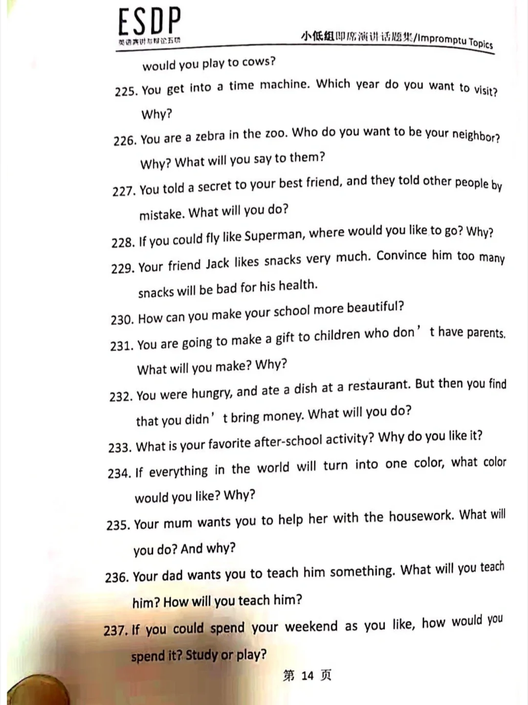 ESDP 小低组英语即兴演讲题库,抓紧练习吧