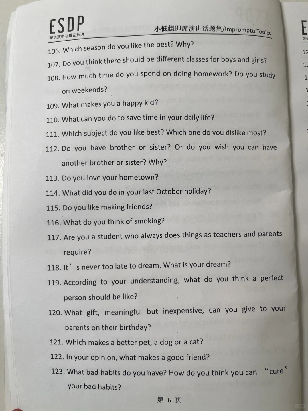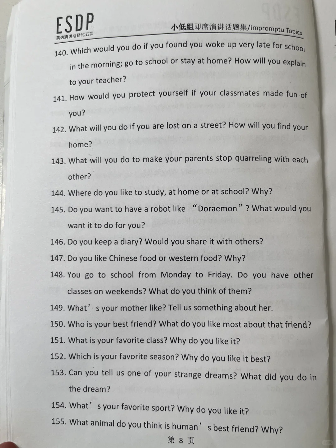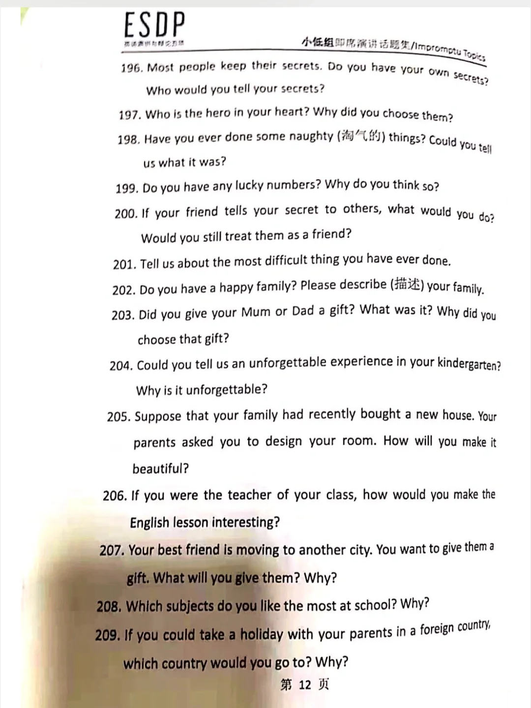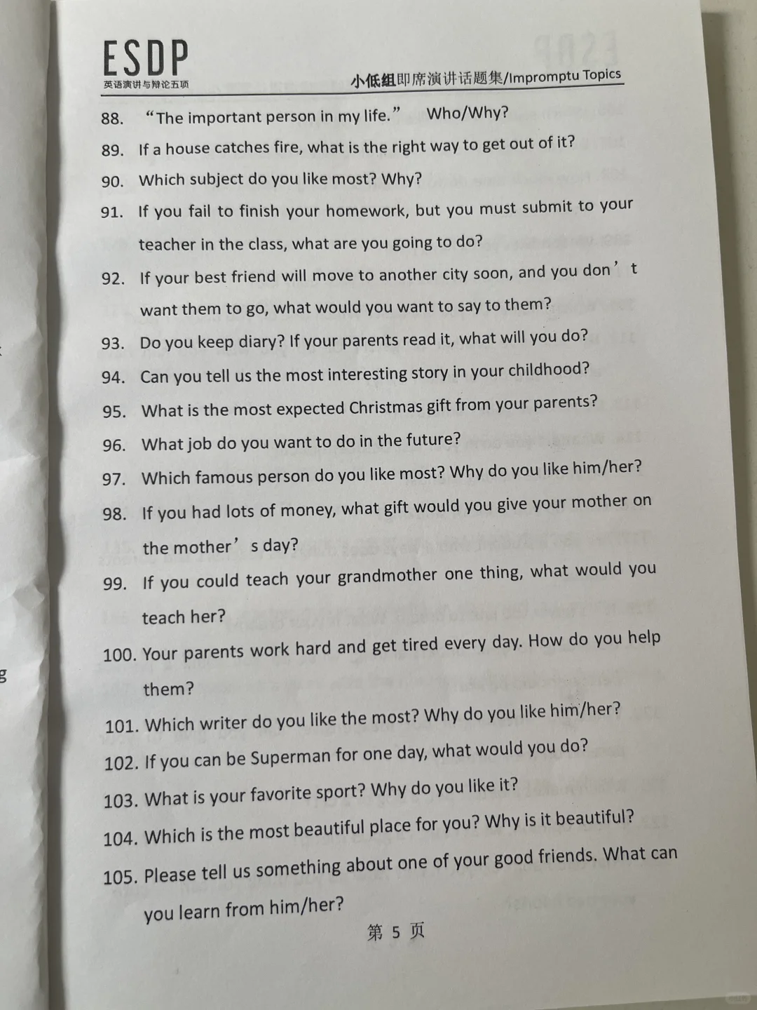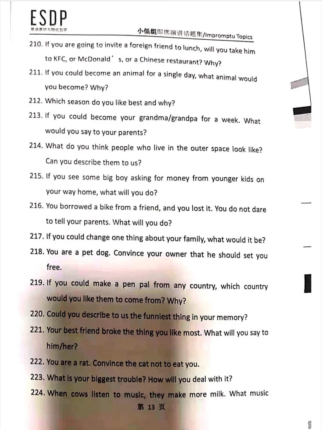 ESDP 小低组英语即兴演讲题库,抓紧练习吧