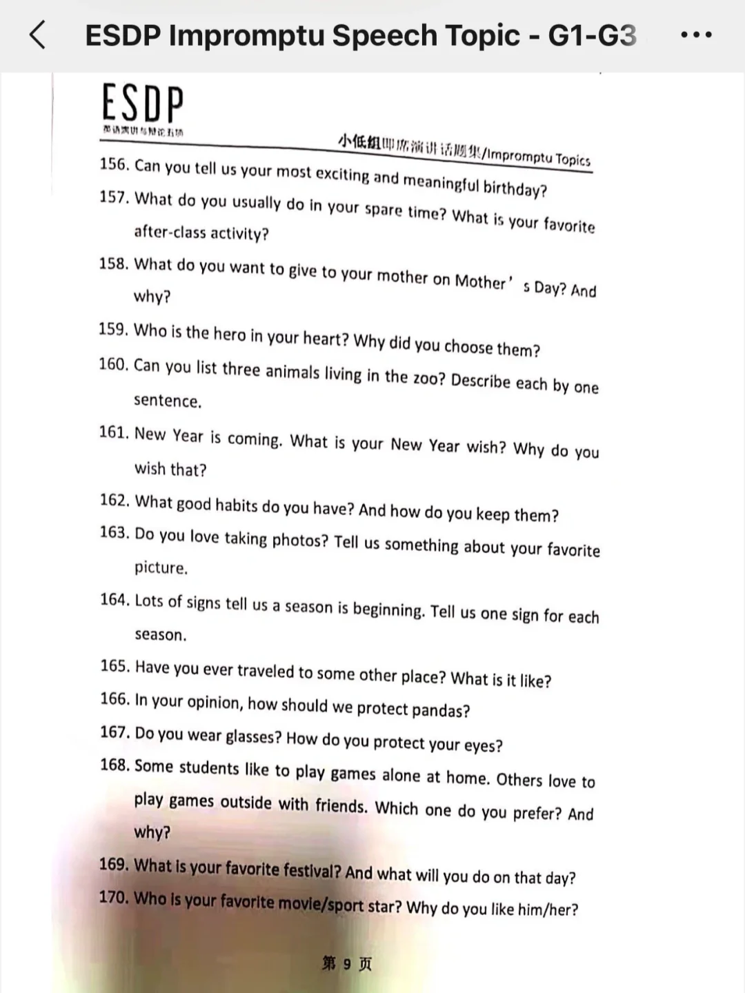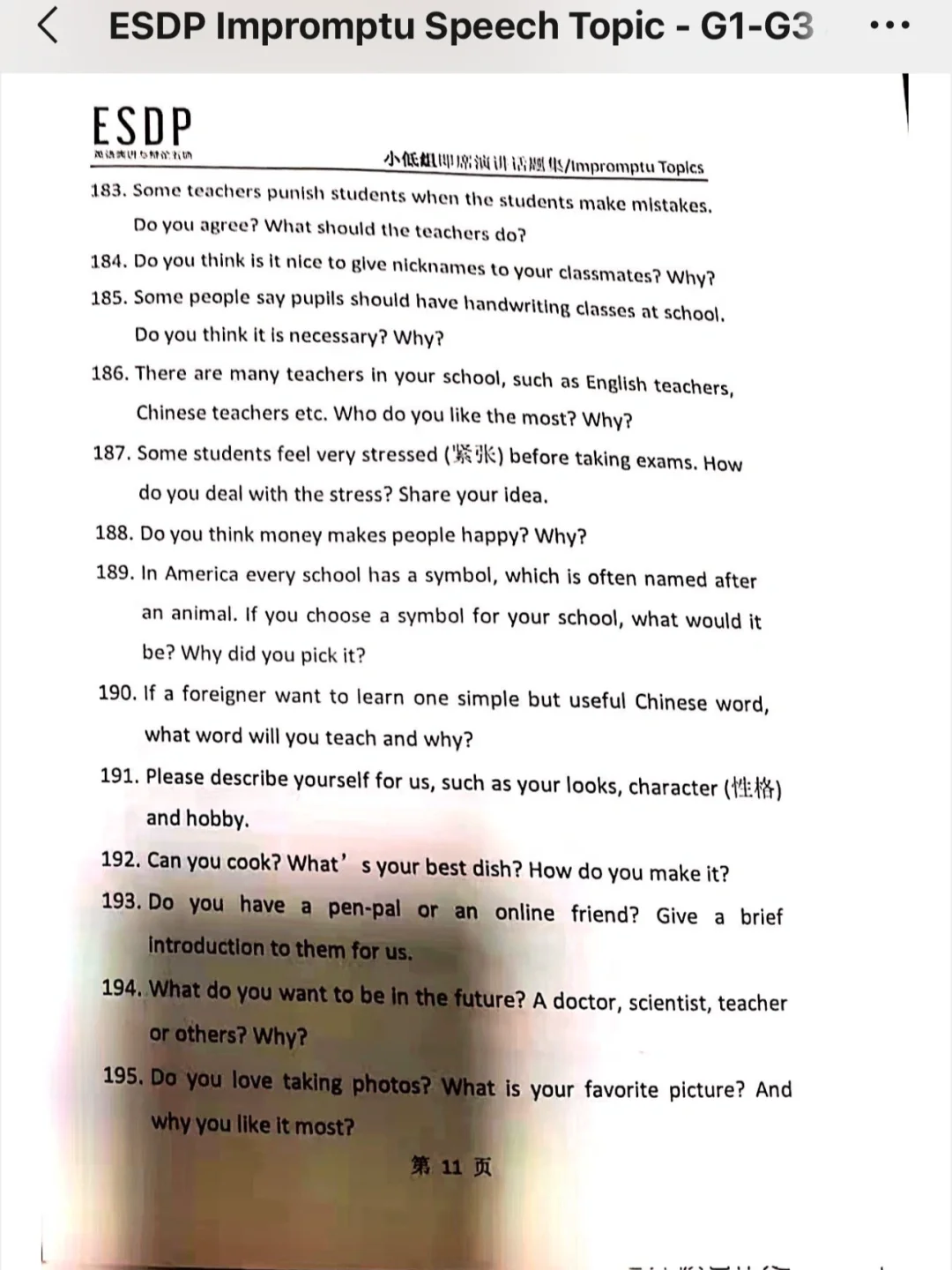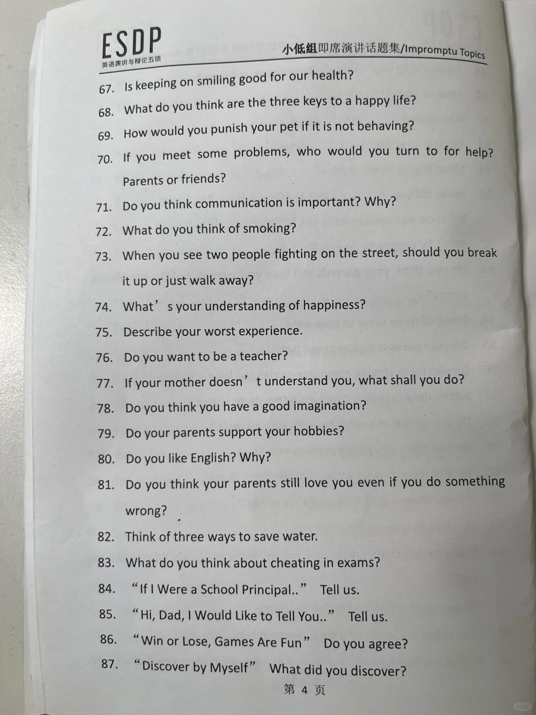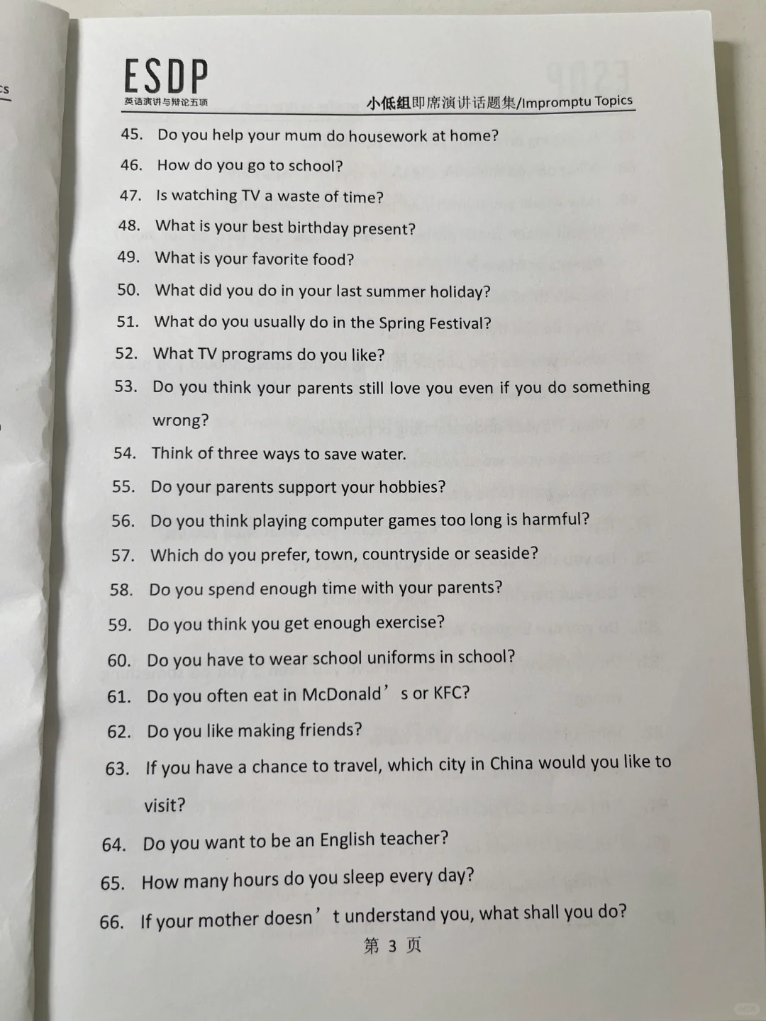 ESDP 小低组英语即兴演讲题库,抓紧练习吧